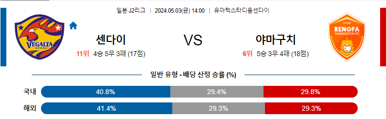 야마구치가 전방에 힘을 주는 상대를 끌어당기고, 역습으로 한 방을 날리는 데 능한 편이다. 일단 굳히기에 능한 전력이라는 점이 큰데, 지난 매치에서도 중앙을 굳히면서 승부를 한 골 차이로 지킨 것이 승리로 이어지기도 했다. 센다이의 전개 능력을 감안해도, 한 골 정도로 실점을 통제한다면 신승 양상으로 만드는 것은 노려볼 수 있을 것 같다.