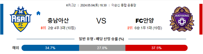 오버(2.5) 양상에서 안양이 승리를 거둘 듯. 두 팀이 서로 라인을 꽤 올리고 플레이를 하는 팀이다. 다만 실점을 통제하는 능력에서는 안양이 한 수 위인 모습. 침투에 능하고 외국인 공격수들의 효율이 매우 좋은 안양을 상대로 아산이 리스크를 감수하고 맞불로 달려드는 것이 옳은 선택이라고 보지는 않는다.