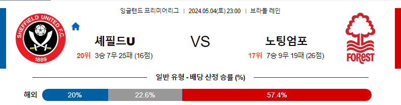 노팅엄이 승리를 기록할 것. 일단 셰필드보다는 노팅엄의 동기 부여가 더 강력할 가능성이 높고, 무엇보다도 셰필드의 수비가 너무 빈약한 상황이다. 노팅엄이 그나마 맨시티 전에서 역습으로 어느 정도 찬스를 만들어본 장면이 있었다는 점을 감안해야 할 듯.