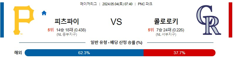 4연패에 빠진 피츠버그와 5연패를 당하고 있는 콜로라도의 만남 이다. 선발 싸움에서 밀리는 팀이 방망이의 힘으로 역전을 만들기는 힘들다고 생각되며 마틴 페레즈 투수가 선발 싸움에서 우위에 있다.