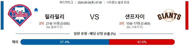 팀 리듬에서 필라델피아가 근소한 우위에 있지만 전일 경기에서 보스턴 상대로 3-1 승리로 2연패에서 벗어난 SF도 터닝 포인트를 만들었다고 생각되며 조단 힉스 투수는 올시즌 초반 6경기에서 모두 자신의 몫을 해내고 있는 투수다.