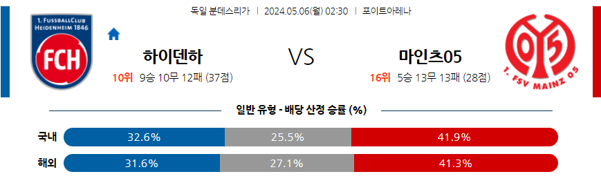 [킹콩티비] 05월 06일 하이덴하임 vs 마인츠 분데스리가 생중계, 스포츠분석,스포츠중계