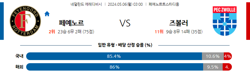 [킹콩티비] 05월 06일 페예노르트 vs 즈볼레 에레디비시 생중계, 스포츠분석,스포츠중계