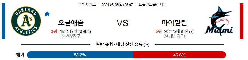[킹콩티비] 05월 05일 오클랜드 vs 마이애미 MLB 생중계, 스포츠분석,스포츠중계