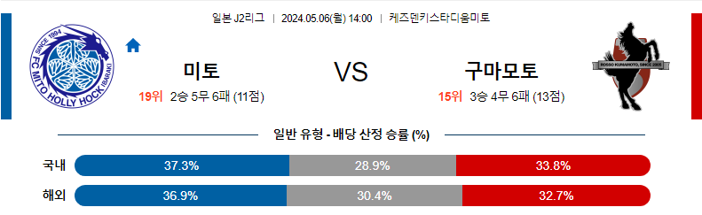 언더(2.5)를 1순위로 삼고, 무승부나 구마모토의 신승 양상을 기대하고 있다. 구마모토의 경기력이나 전반적인 득점력 기복이 큰 편. 그래도 짧은 패스로 나아가는 양상을 보여줄 수는 있다. 미토가 상대 빌드업이 유려한 상황에서는 제법 고전하는 양상도 있다는 점을 무시하기는 어려울 수 있겠다.
