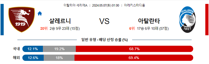 아탈란타의 승리를 유력하게 보고 있다. 살레르니타나가 중원이 좋은 팀을 만나서는 별다른 활약을 하지 못하고, 수비가 2골 이상을 내주면서 쉽게 무너지는 양상이 나오고 있다. 아탈란타가 리그에서의 챔스권 돌입을 위해서, 어느 정도 FULL 전력을 동원할 수 있는 상태. 아탈란타의 경기 플랜에 큰 문제는 없을 가능성이 높다.