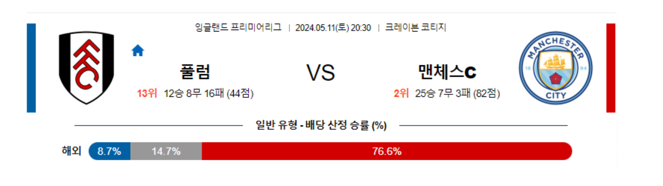 [킹콩티비] 05월 11일 풀럼 vs 맨시티 EPL 생중계, 스포츠분석,스포츠중계