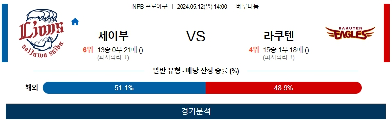 [킹콩티비] 05월 12일 세이부 vs 라쿠텐 NPB 생중계, 스포츠분석,스포츠중계