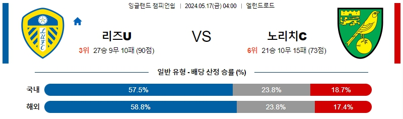[킹콩티비] 05월 17일 리즈 vs 노리치 챔피언쉽 생중계, 스포츠분석,스포츠중계