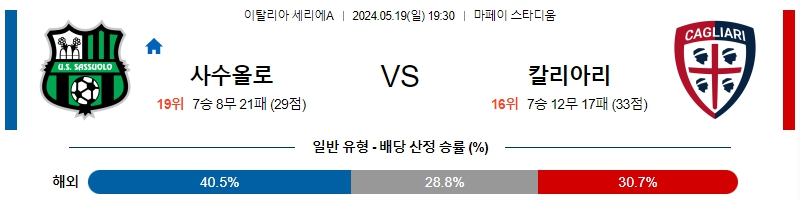 [킹콩티비] 05월 19일 사수올로 vs 칼리아리 세리에A 생중계, 스포츠분석,스포츠중계