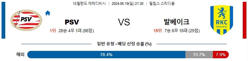 [킹콩티비] 05월 19일 PSV vs 발바이크 에레디비시 생중계, 스포츠분석,스포츠중계