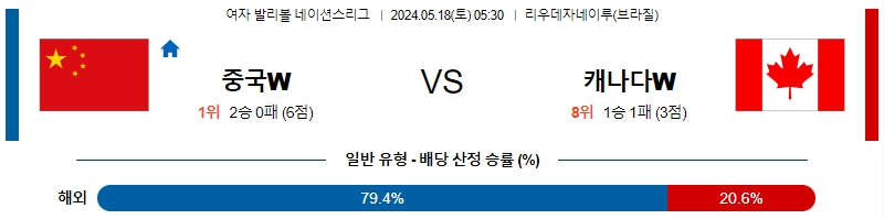 리우데자네이루(브라질) 중립구장에서 펼쳐지는 경기다. 캐나다는 아웃사이드 히터 자원들의 공격력은 뛰어나지만 리시브에 약점이 있다. 또한, 좌우날개의 큰 공격에 대한 의존도가 높은 만큼 중국의 높은 블로킹에 고전할 것이다.