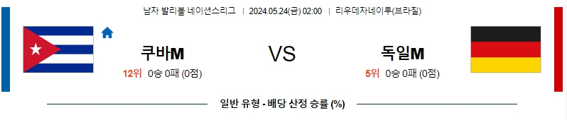 리우데자네이루(브라질) 홈에서 펼쳐지는 경기다. 쿠바는 아직 프랑스 파리행 티켓을 확보하지 못했고 독일은 올림픽 티켓을 확보했다. 세터 아돈 다이크의 고공 토스를 받은 쿠바 공격수들의 화려한 공격력이 나올 것으로 예상되는 경기.