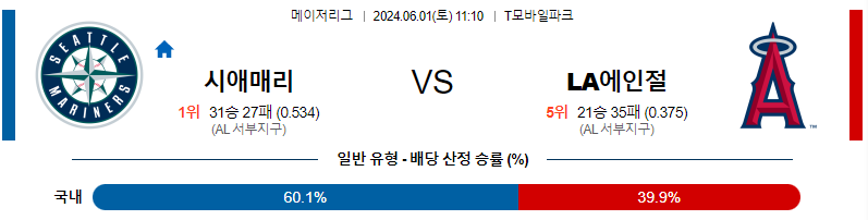 [킹콩티비] 06월 01일 시애틀 vs LA에인절스 MLB 생중계, 스포츠분석,스포츠중계