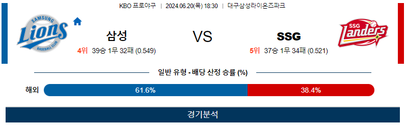 전날 경기에서 SSG의 불펜은 그야말로 크게 무너져버렸다. 특히 삼성 타선의 타격감을 살려주었다는 점이 이번 경기에 악영향을 미칠 수 있는 부분. 송영진이 이전 삼성과의 맞대결에서 호투를 해내긴 했지만 원정에서 기세가 오른 삼성 타선을 막는건 솔직히 힘들어 보인다. SSG의 타선이 코너 상대로 나름 드잡이질을 해줘야 하지만 삼성의 주력 불펜들은 휴식이 충분하고 SSG의 불펜은 쉽게 재기가 힘들어 보인다. 전력에서 앞선 삼성이 승리에 가까이 있다.