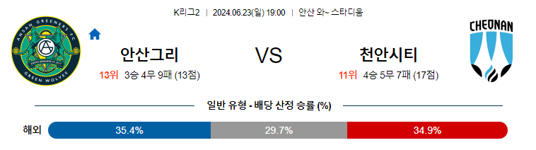 천안이 승리를 기록할 것. 일단 안산도 라인을 올릴 것을 천명했지만, 오히려 천안이 공격적으로 나서는 상황에서는 상대가 올라오는 것을 반길 수 있다. 물론 여전히 천안의 수비력을 신뢰할 수 있는 단계는 아니라고 하더라도, 그래도 안산이 결정력에서 훌륭한 모습을 보여주는 유형이라고 하기는 어렵다.