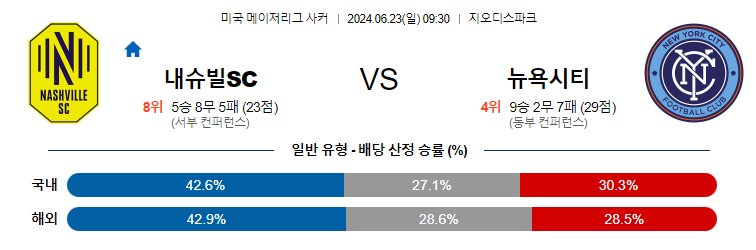 언더(2.5) 양상으로 간다면 내슈빌의 승리도 나쁘지 않은 상황이다. 공격을 억제하고 한 방으로 경기를 가져오는 데 능한 전력. 뉴욕시티가 지공 성향을 보여줄 것으로 보이는데, 전개 속도가 그렇게까지 빠르다고 보기 어렵다. 결정적으로 뉴욕시티는 경기 지배력이 원정에서는 떨어지는 편이다.