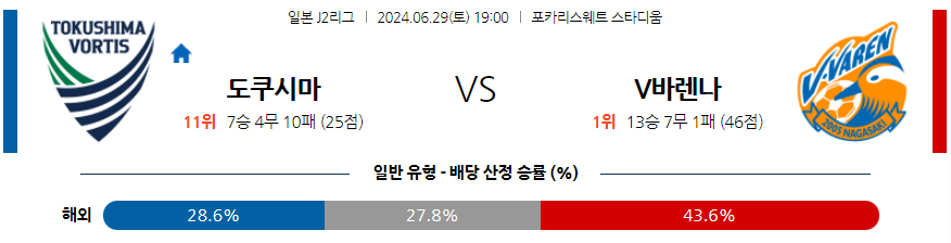 [킹콩티비] 06월 29일 도쿠시마 보르티스 vs V-발렌 나가사키 J리그2 생중계, 스포츠분석,스포츠중계