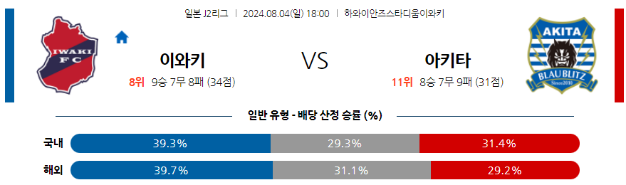 아키타 승리와 언더(2.5)를 픽해볼 수 있을 것 같다. 이와키가 오픈플레이에서의 공격력이 그다지 훌륭한 편은 아니고, 특히 아키타의 간결한 롱볼 운영에 오히려 한 골 싸움에서 피해를 보는 경우가 잦다. 대체적으로 롱볼 위주의 공격이 다득점을 보장하는 것은 아니라고 보는 것이 합당하기는 하나, 전적에서도 정규리그에서는 아키타가 우위였던 것이 사실.