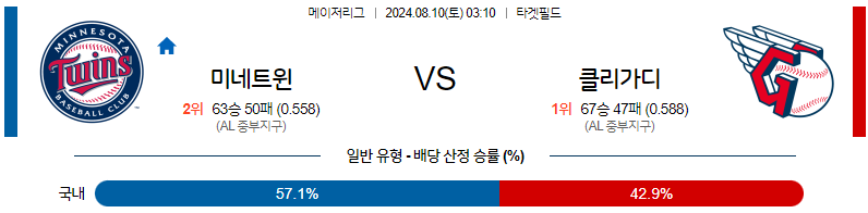[킹콩티비] 08월 10일 미네소타 vs 클리블랜드 MLB 생중계, 스포츠분석,스포츠중계