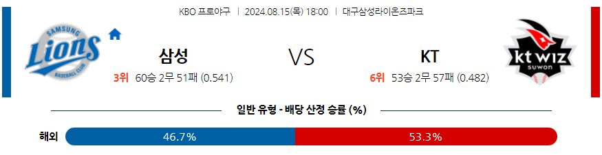 [킹콩티비] 08월 15일 삼성 vs KT KBO 생중계, 스포츠분석,스포츠중계