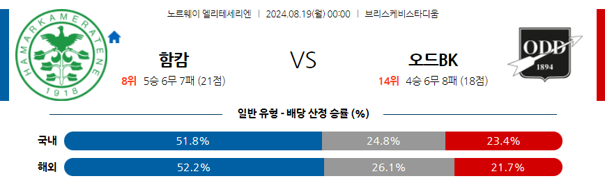 [킹콩티비] 08월 19일 함캄 vs 오드 BK 노르웨이1부 생중계, 스포츠분석,스포츠중계