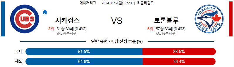 [킹콩티비] 08월 19일 시카고컵스 vs 토론토 MLB 생중계, 스포츠분석,스포츠중계