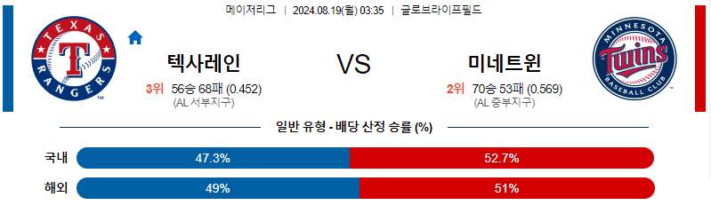 [킹콩티비] 08월 19일 텍사스 vs 미네소타 MLB 생중계, 스포츠분석,스포츠중계