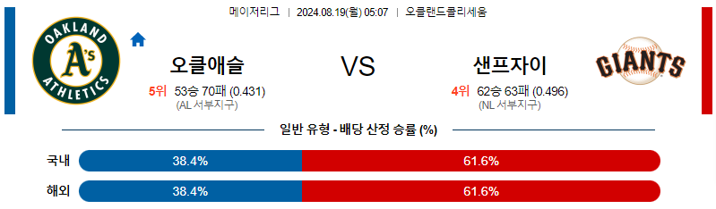 [킹콩티비] 08월 19일 오클랜드 vs 샌프란시스코 MLB 생중계, 스포츠분석,스포츠중계