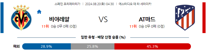 객관적 전력은 AT 마드리드가 낫지만, 원정이다. 비야 레알의 전력이 약간 떨어지지만, 그래도 강하다.