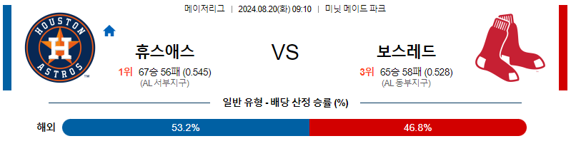 후반기의 보스턴은 좌완 상대 부진이 심각한 레벨이다. 각성한 키쿠치 공략은 대단히 힘들듯. 최근 부진한 휴스턴의 타격이 관건인데 하우크의 원정 투구를 고려한다면 반등 가능성이 높고 무엇보다 불펜에서 서서히 우위를 점유할수 있다. 투수력에서 앞선 휴스턴 애스트로스가 승리에 가까이 있다.