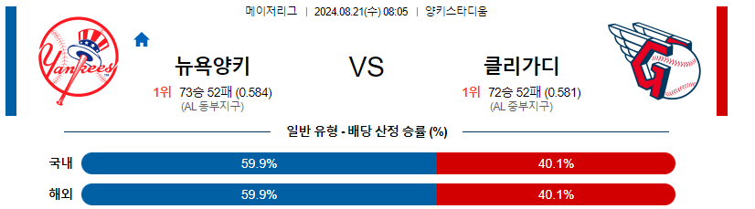 [킹콩티비] 08월 21일 뉴욕양키스 vs 클리블랜드 MLB 생중계, 스포츠분석,스포츠중계