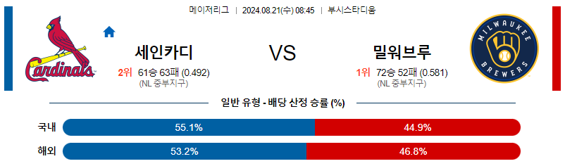 [킹콩티비] 08월 21일 세인트루이스 vs 밀워키 MLB 생중계, 스포츠분석,스포츠중계