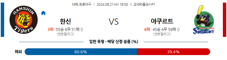 [킹콩티비] 08월 21일 한신 vs 야쿠르트 NPB 생중계, 스포츠분석,스포츠중계