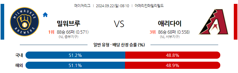 [킹콩티비] 09월 22일 밀워키 vs 애리조나 MLB 생중계, 스포츠분석,스포츠중계