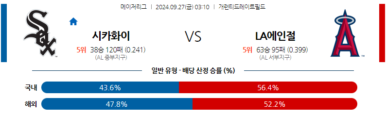 [킹콩티비] 09월 27일 시카고W vs LA에인절스 MLB 생중계, 스포츠분석,스포츠중계