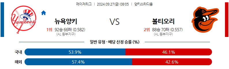 [킹콩티비] 09월 27일 뉴욕양키스 vs 볼티모어 MLB 생중계, 스포츠분석,스포츠중계