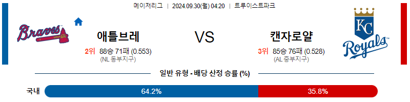 전날 경기의 흐름, 그리고 선수 운용을 고려한다면 캔자스시티는 딱히 승리에 관한 고집이 없어 보인다. 이번 경기도 느긋하게 경기를 이끌어갈듯. 반면 애틀랜타는 무조건 승리를 노리는 흐름을 이어가고 있고 캔자스시티는 레이간스를 아꼈다. 전력에서 앞선 애틀랜타 브레이브스가 승리에 가까이 있다.