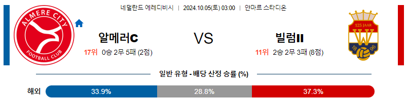 두 팀 모두 공격 전개가 단순하고 창의성이 부족하다. 알메러 시티와 빌렘 모두 수비를 중시하는 만큼, 경기에서 대량 득점은 기대하기 어렵다. 결국 지루한 공방 끝에 무승부로 마무리될 가능성이 크다.