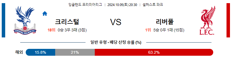 리버풀이 경기를 주도할 가능성이 크다. 크리스탈 팰리스는 수비 라인의 불안정함과 공격 전개에서의 문제로 리버풀의 압도적인 전개에 대응하기 어려울 것이다. 리버풀의 무난한 승리가 예상되며, 크리스탈 팰리스의 공격은 큰 위협이 되지 못할 것으로 보인다.