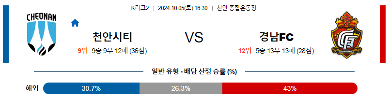 ❌ 천안 (대한민국 2부 9위 / 최근 5전: 패무승승패)