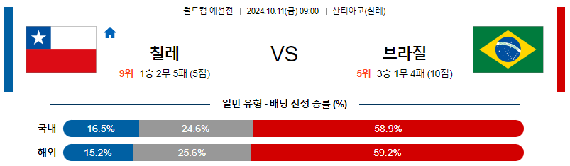 브라질은 최근 파라과이전에서 1-0 패배를 당했다. 호드리구(RW / 레알 마드리드)와 하피냐(AMC / 바르셀로나)를 중심으로 지공 전개를 펼치며, 마르티넬리(LW / 아스날)가 비니시우스(FW / 레알 마드리드)의 공백을 메울 것이다. 마르퀴뇨스(DC / PSG)와 가브리엘(DC / 아스날)의 수비 조합은 빠른 발과 견고한 수비력으로 칠레의 역습을 막을 수 있을 것이다. 기마랑이스(DM / 뉴캐슬)는 활발한 활동량으로 중원을 지배하며 상대의 엉성한 공격을 저지할 것이다.