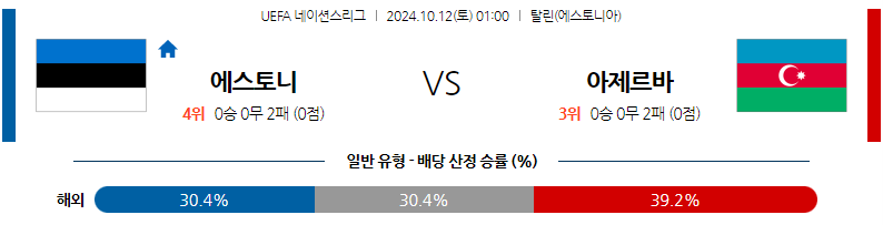 에스토니아는 주력 자원들의 결장으로 공격력이 크게 떨어질 전망이다. 아제르바이잔은 나름 경기를 주도하려 하겠지만, 공격 라인의 불협화음으로 인해 득점 기회를 많이 만들지 못할 것이다. 결국 두 팀 모두 공격에서 효과적인 모습을 보이지 못하며 지루한 무승부로 경기가 마무리될 가능성이 크다.