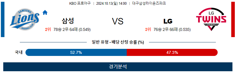 [킹콩티비] 10월 13일 삼성 vs LG KBO 생중계, 스포츠분석,스포츠중계