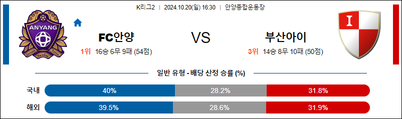 부산은 안양의 공격이 세밀하지 못할 것을 예상하고, 밀집 수비를 통해 승리할 가능성이 높다. 반면 안양은 공격에서의 기복으로 인해 부산의 수비를 공략하기 어려울 것이다. 부산의 승리가 유력하며, 언더(2.5 기준) 베팅이 적절할 것으로 보인다.