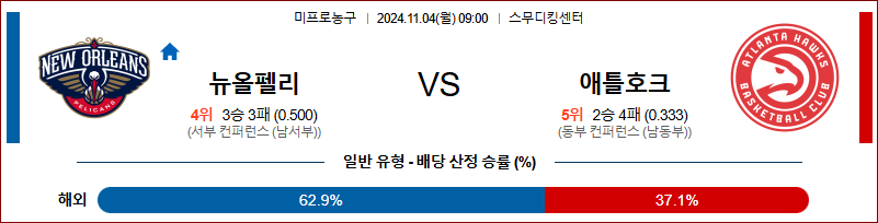 [킹콩티비]11월 04일 뉴올리언스 vs 애틀란타 NBA 해외축구분석 무료중계 스포츠분석