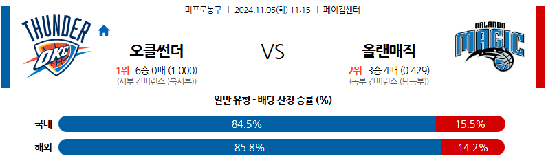 [킹콩티비]11월 05일 오클라호마 vs 올랜도 NBA 해외축구분석 무료중계 스포츠분석