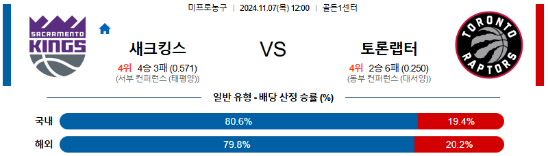 [킹콩티비]11월 07일 새크라멘토 킹스 vs 토론토 랩터스 NBA 해외축구분석 무료중계 스포츠분석
