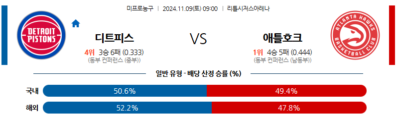[킹콩티비]11월 09일 디트로이트 vs 애틀란타 NBA 해외축구분석 무료중계 스포츠분석