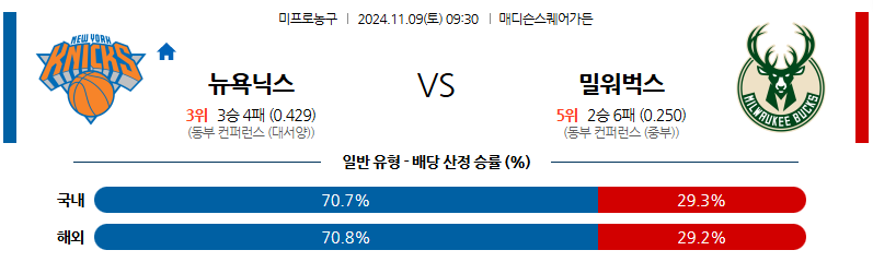 [킹콩티비]11월 09일 뉴욕닉스 vs 밀워키 NBA 해외축구분석 무료중계 스포츠분석